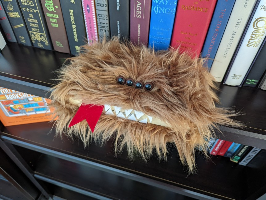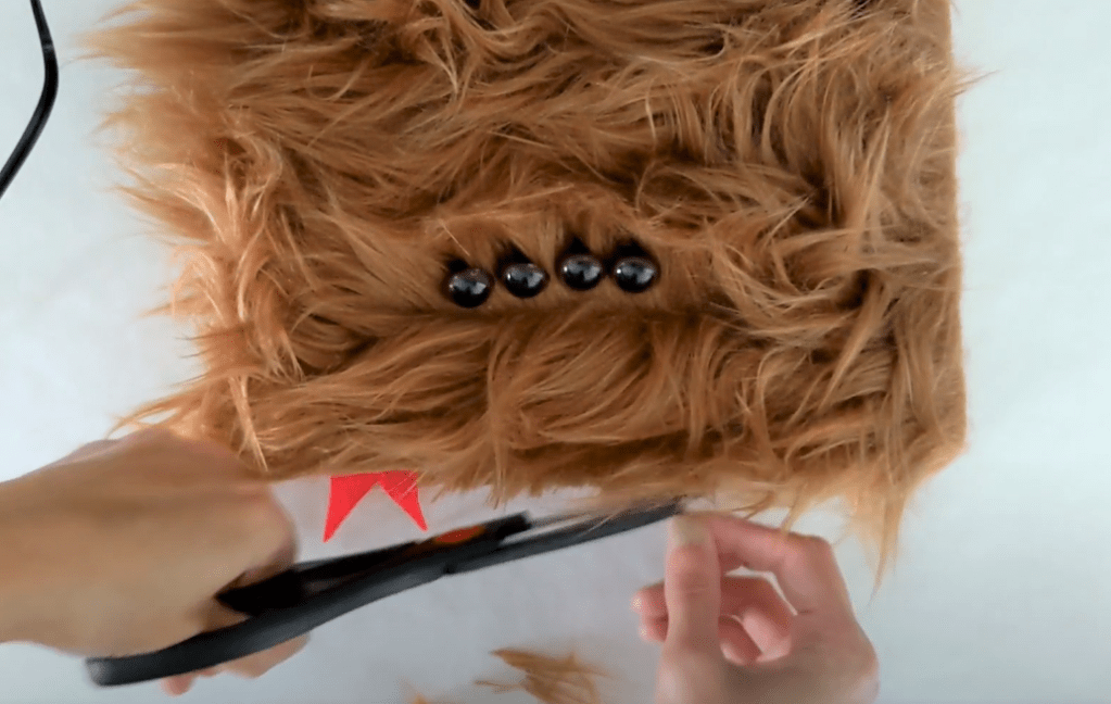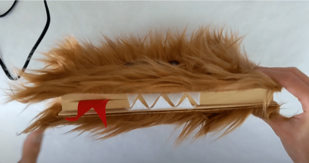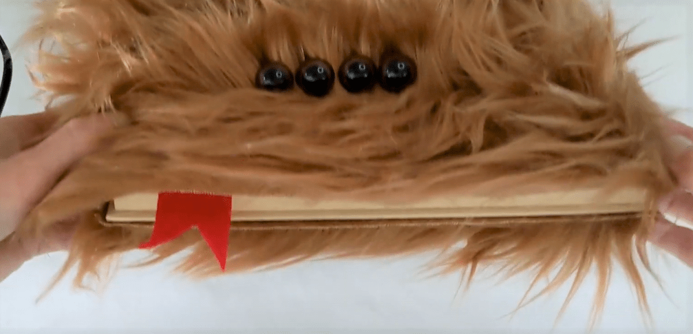 3. Part the fur about 2/3 of the way down the cover (away from the spine). Brush the back of the part straight up and glue the eyeballs directly into that fur. I promise it’s more secure than it sounds!